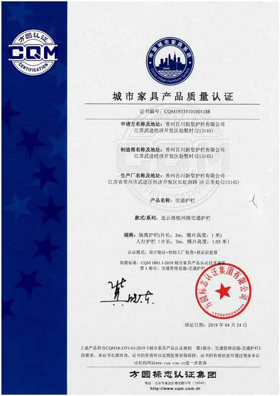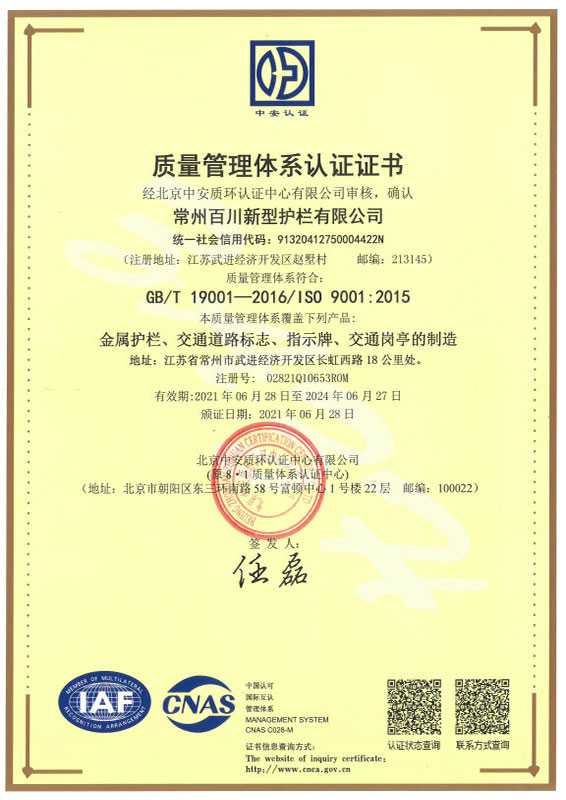 道路護(hù)欄近千萬米、市政輔助設(shè)施近千萬件。公司先后通過了ISO9001質(zhì)量管理體系認(rèn)證、ISO14001環(huán)境管理體系認(rèn)證、ISO45001職業(yè)健康安全管理體系等相關(guān)認(rèn)證。并獲得“質(zhì)量、服務(wù)、信譽(yù)AAA級企業(yè)”、“江蘇質(zhì)量誠信AAA級品牌企業(yè)”、“江蘇省著名品牌”、“江蘇省著名品牌”、“高新技術(shù)企業(yè)”等稱號。